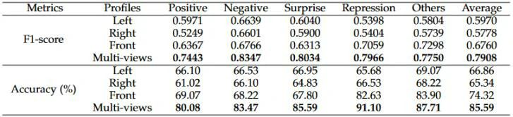 对于情绪识别中,3种个体视图中,前视图表现最好,左视图次之,右视图表现最低。多视角优于3个个体视角,取得了0.7908的平均f1值和85.59%的平均准确率,再次证明了4D数据在ME识别任务中的优势。通过融合多视角来使用4D数据的优势在所有五种情感类别中都是一致的。