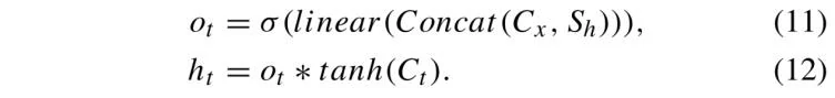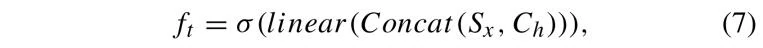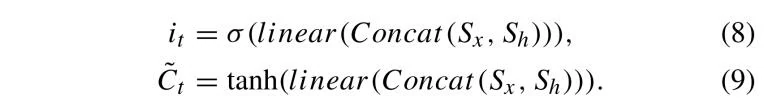 其中,σ 表示 Sigmoid 函数,linear 表示线性映射函数,Concat 表示向量拼接操作。输入门 负责处理当前输入,如公式 (8) 和公式 (9) 所示: