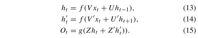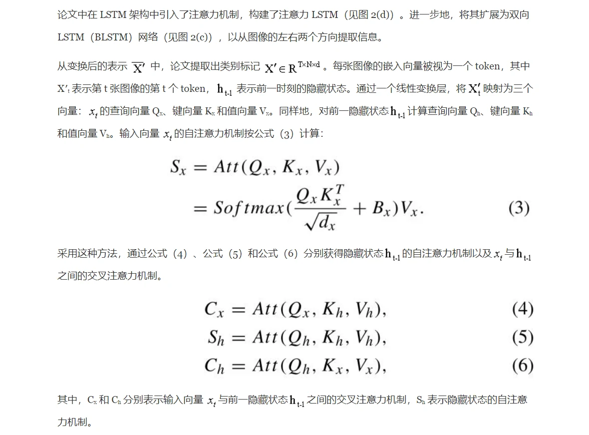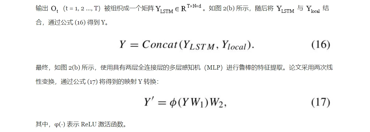 BLSTM 是 RNN 的一种变体,增强了标准 LSTM 在处理长期依赖关系方面的能力。为了进一步提升性能,论文中提出了注意力 BLSTM(Attention BLSTM),该结构在前向和后向两个方向中引入注意力机制,从而实现信息的同步提取,如图 2(c) 所示。在 Forward 层中,注意力 LSTM 按顺序从第 1 个 token 处理到第 T 个 token,逐步获取前向隐藏层的输出。相反,在 Backward 过程中,注意力 LSTM 按相反顺序从第 T 个 token 处理到第 1 个 token,逐步获取后向隐藏层的输出。六个权重 V、V′、U、U′、Z 和 Z′ 被迭代使用,以通过公式 (13)、(14) 和 (15) 融合前向和后向层的输出。