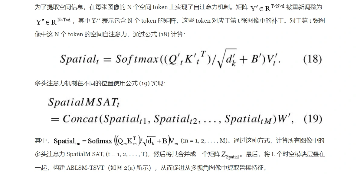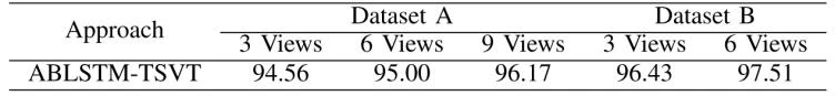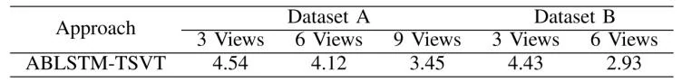 首先,论文中使用标准的自注意力模块来捕捉空间依赖性,该方案作为基线(baseline)。随后,引入邻域时间注意力来学习多视角图像间的时间依赖性,该方案被记作 (baseline)+ 局部时间注意力。类似地,将局部时间注意力替换为注意力BLSTM模块,此方案记作 (baseline)+ BLSTM注意力。最后,同时结合局部时间注意力模块与注意力BLSTM模块提取时间信息,同时保留标准的空间自注意力机制,用于空间特征学习,构成 ABLSTM-TSVT模型(baseline+BLSTM注意力 + 局部时间注意力)。