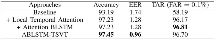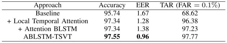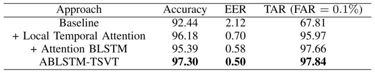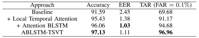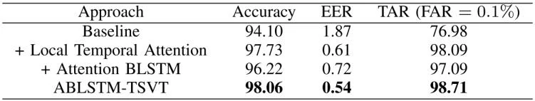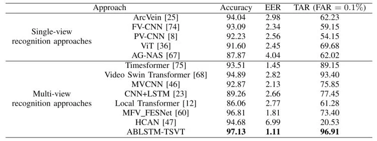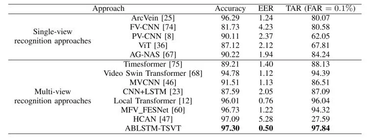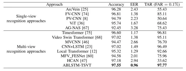 为了评估所提方法的有效性,论文中将 ABLSTM-TSVT 与代表性的 2D 单视角识别方法,以及 3D 多视角识别方法进行比较。常用的均衡误差率(EER)用于评估性能,它是虚假接受率(FAR)等于虚假拒绝率(FRR)时的点。此外,采用了TAR@FAR = 0.1%,其中TAR = 正确接受的合法用户数 / 所有合法用户数,FAR = 错误接受的非法用户数 / 所有非法用户数,TAR@FAR = 0.1%是指FAR 限制在 0.1% 的时候,系统对合法用户的接受率是多少。表 一、二、三、四 和 五 展示了在两个数据集上各种方法的识别准确率。