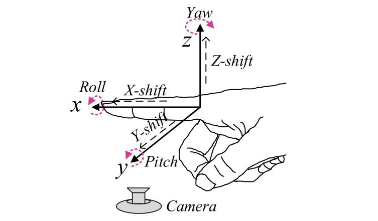 指静脉识别仍然是一项具有挑战性的任务,因为多种因素会导致图像质量下降,这些因素可大致分为两类:一是外部因素,如环境光照、温度变化以及光散射等,这些会在图像中引入噪声、不规则阴影,甚至造成静脉图案缺失;二是内部因素,如用户的操作行为,可能会引起图像的旋转和平移。在图像采集过程中,用户的手指可能沿 X、Y、Z 三个轴发生平移与旋转:其中,X 和 Y 轴方向的平移会影响图像中手指区域的位置,Z 轴方向的平移则会改变其尺度;而沿这三个轴的旋转——即滚转、俯仰和偏航——会以不同方式影响最终图像。具体而言,偏航可能使手指在图像中产生旋转,俯仰可能导致手指变形从而造成静脉结构扭曲,尤其值得注意的是,滚转会改变三维血管结构在二维图像上的投影角度,尤其在大角度时,不同视角下同一手指采集到的静脉图像差异会变得十分显著,最终导致注册图像与测试图像之间的不匹配,从而影响识别性能。由于大多数用户对静脉识别缺乏专业知识,在图像采集时可能错误地放置手指,进一步加剧了采集图像之间的差异。而无接触式采集系统则往往带来更多的变化,包括旋转、平移和尺度变化。