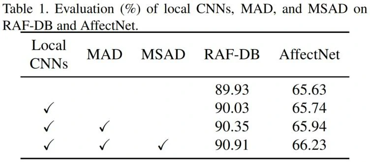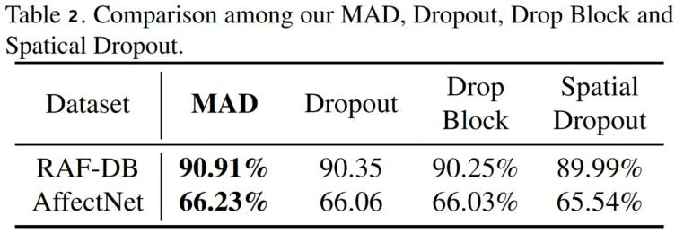 表1展示了依次往模型添加文章提出的不同模块时在RAF-DB和AffectNet上的测试结果。需要说明一下的是,在文章展示的模型结构图中,MAD是包含在Local CNNs的,但后续的实验中Local CNNs表示不包含MAD的其余结构。从表中可以看到,在使用了Local CNNs,以及不断添加了MAD和MSAD后,两个数据集上的实验效果也是不断提升的,证明了文章提出的这些模块都是有效的。而文章中最核心的创新点MAD机制对比直接使用Dropout或者类似的机制如Drop Block[7]、Spatial Dropout[8]文章作者也专门进行了对比实验,实验结果如表2所示。从表2可以看到,对比同类的机制,文章提出的MAD分别在RAF-DB和AffectNet上至少提升了0.56%和0.17%,证明了MAD是有效的。