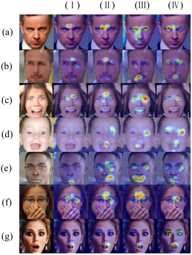 最后一个值得关注的实验是可视化的实验,图3展示了不同方法在AffectNet不同类别的一个图像示例上的注意力可视化结果。其中,图3(a)至(f)每一行分别表示愤怒、厌恶、恐惧、开心、中立、悲伤以及惊讶的表情。第一列代表原始图像,第二列至第三列分别是基准方法、只使用Local CNNs的方法、Local CNNs加上了MAD的方法以及完整TransFER的方法的注意力可视化效果。从可视化结果我们可以看到在未添加MAD前,无论是基准方法还是使用Local CNNs但未加MAD的方法对大部分表情重点只关注一个面部区域的特征。而在使用了MAD之后,模型会关注多个面部区域并将它们互相关联,共同用于辅助对最终结果的判断,因此文章提出的改进方法是有效的。