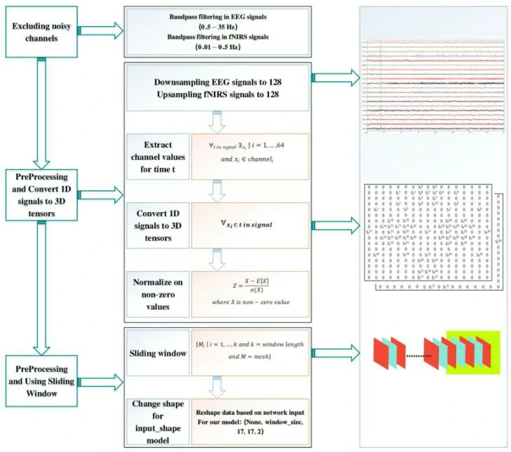 在所提出的方法中,使用关于电极位置的知识将原始生物信号转换成三阶张量。这些三级张量显示了每个时刻的大脑地形图。然后,使用滑动窗口来创建数据剪辑。滑动窗口旨在利用生物信号中的时间相关性。在每个片段中,同时存在空间和时间特征。在这些排列之后,深度学习用于基于获得的三级张量来训练模型。本文可以通过改进预处理步骤和采用专门针对EEG-fNIRS组合的深度学习算法来提高诊断准确率。