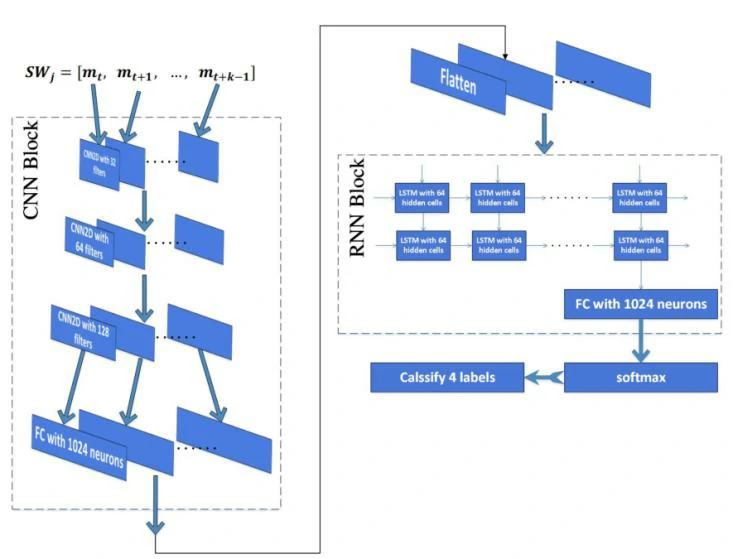 然后,一个全连接层接收提取的空间特征序列 SFj 并将它们馈送到 LSTM 层以提取时间特征。最后,一个全连接层从 LSTM 最后一个输出层接收时间特征,然后输入 Softmax 层进行预测。