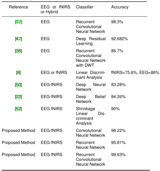 柏林工业大学的 EEG-fNIRS 数据集被本文用于评估RCNN网络。本文提出了一种基于深度学习的新模型,包括 CNN 和 RNN 算法的结合。本文将所提出模型的准确性与不同论文中的其他模型进行比较。其次,本文调查了不同实现的准确性。最后,本文分析了基于 epoch 数的准确度图。