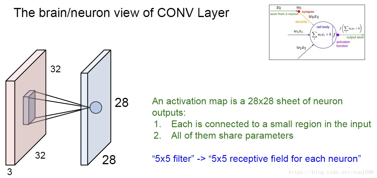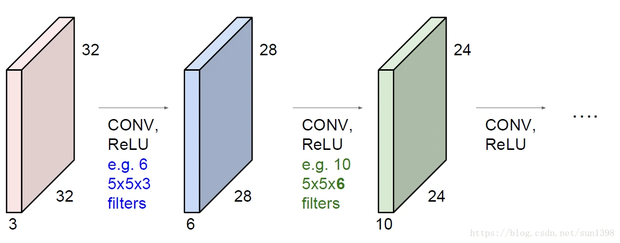 - 经过两层卷积层后的数据结构变化,维度从3232–2828–24*24,宽和高是在缩小,深维度由每层滤波器个数决定。