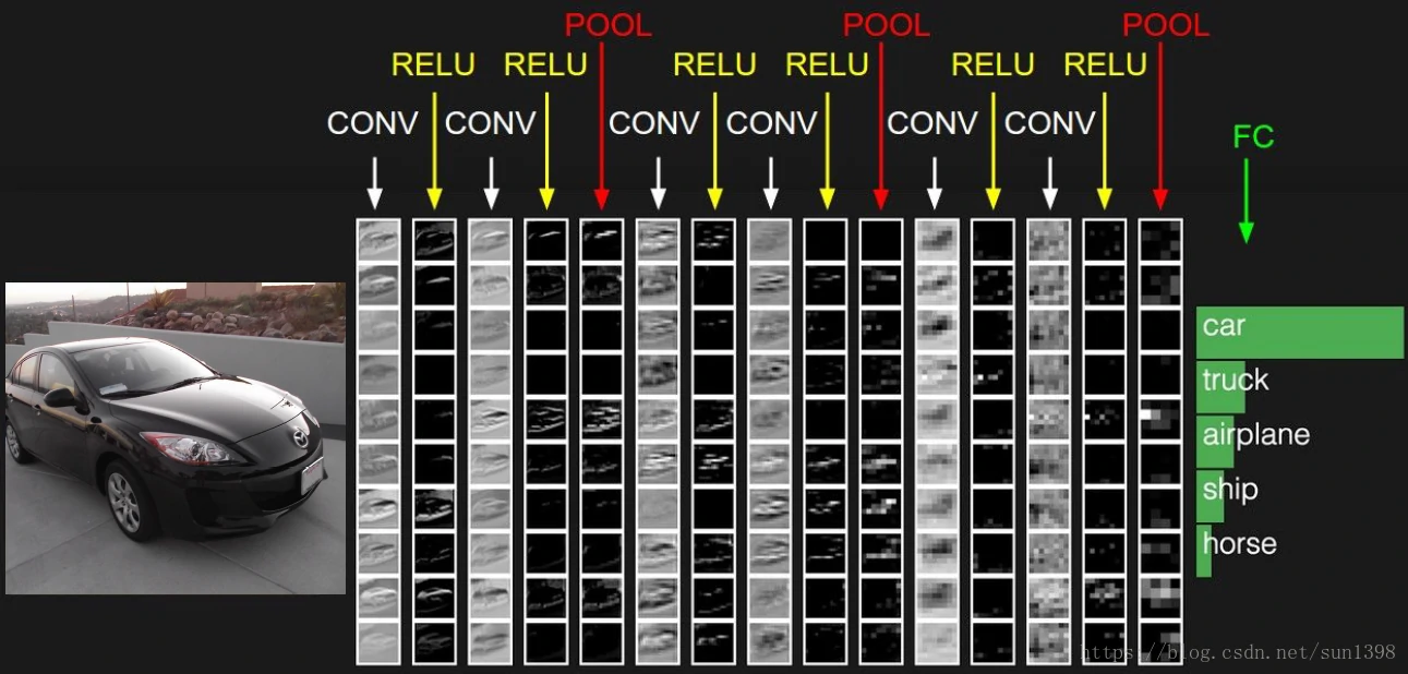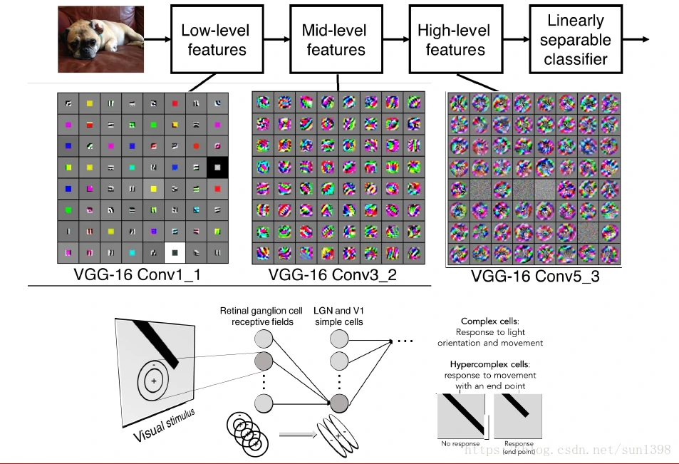 - 卷积神经网络不同层提取的特征不一样,越靠前的网络提取的特征越简单,越往后越复杂,可以通过可视化的展现来观察不同层的功能。