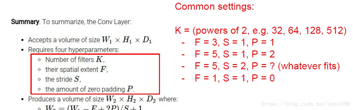 - 实际上对于卷积层,参数包括;滤波器数量K、滤波器大小F、步长S和填充padding;实际上可以用偶数滤波器,但不常见,因为偶数没有中间,通常3是最常见的最小滤波器大小。
