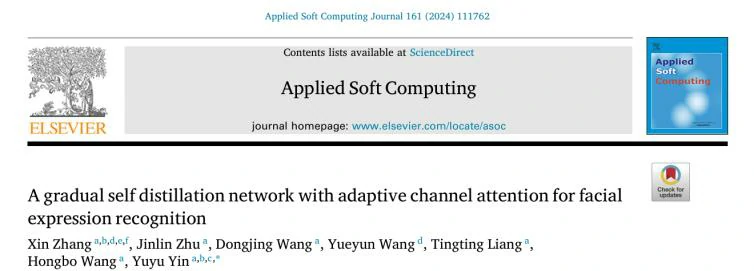 该论文发表于Applied Soft Computing(中科院1区,IF=7.2),题目为《A gradual self distillation network with adaptive channel attention for facial Expression recognition》。
