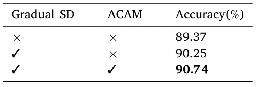 为了验证渐进式自蒸馏策略和自适应通道注意模块(ACAM)的有效性,作者在RAF-DB数据集上进行了消融实验。实验结果表明,基线模型(ResNet50)与没有渐进式自蒸馏或ACAM的模型相比,采用渐进式自蒸馏策略后,准确率提高了0.88%;结合渐进式自蒸馏和ACAM后,准确率进一步提高了1.37%。这一消融实验充分证明了渐进式自蒸馏策略和ACAM在GSDNet中的有效性。下表展示了渐进式自蒸馏和ACAM的实验结果。