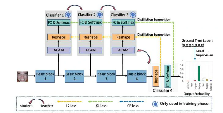 面部表情识别(Facial Expression Recognition, FER)在安全、医疗和智能交互等领域有广泛应用,但现有方法在应对表情的多样性、数据质量问题以及实时应用的计算效率方面存在挑战。传统知识蒸馏需要教师网络,训练复杂,而现有自蒸馏方法在浅层特征学习中缺乏多样性,限制了模型性能。本文提出了一种渐进式自蒸馏网络(GSDNet)与自适应通道注意机制(ACAM)结合的新方法。GSDNet通过逐层知识蒸馏增强浅层特征学习的多样性,ACAM动态优化特征通道权重。该方法在RAF-DB、FERPlus和Affect-Net等数据集上实现了精度和效率的提升,为实际应用提供了一种轻量化解决方案。
