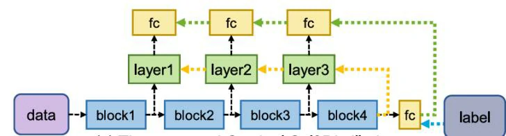 GSDNet提出的渐进式自蒸馏策略通过以下方式优化知识传递过程:首先将整个网络划分为多个层级结构的基本块,每两个相邻块之间形成“教师-学生”对。深层块作为教师,浅层块作为学生;然后通过逐层的蒸馏学习,使得深层块逐步将高语义特征传递给浅层块,避免浅层块从单一深层块中学习导致的特征单一化问题;在训练阶段,采用KL散度损失和L2损失对特征分布和概率分布进行优化,确保浅层块学习到的知识与深层块相符。下面是渐进式自蒸馏策略展示图。