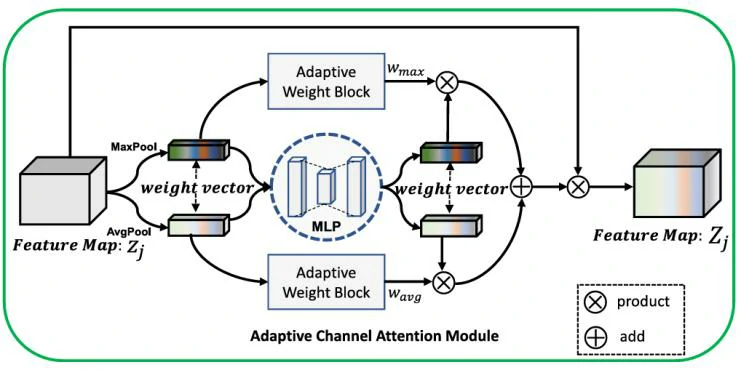 自适应通道注意模块(Adaptive Channel Attention Module, ACAM)是一种轻量化、高效的注意机制,专注于优化图像特征的表达能力,提升模型对关键区域的关注。模块通过动态调整不同通道的权重,将最大池化和平均池化相结合,分别提取局部和全局特征信息。最大池化捕获局部激活值,强调细节特征,而平均池化则关注全局趋势,体现整体信息。两种特征经过全连接网络(MLP)计算权重比例,动态融合生成最终特征向量,用以更新特征图的通道权重。这一机制能够突出重要区域(如眼睛、嘴角等),抑制冗余信息,显著增强模型在复杂场景中的适应性和鲁棒性。与传统注意力机制不同,ACAM通过动态权重分配实现了针对性优化,同时保持了轻量化的设计,适用于各类深度学习网络。实验验证显示,ACAM在遮挡、模糊等复杂环境下表现优异,显著提升表情识别的准确性和泛化能力,是优化网络特征提取的重要工具。下面是ACAM的详细结构图。
