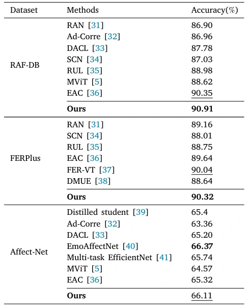 与现有的最先进方法相比,GSDNet在面部表情识别任务中表现出色。具体来说,在RAF-DB数据集上,GSDNet的准确率为90.91%,比第二名高出0.62%。在FERPlus数据集上,GSDNet也取得了最好的成绩,提升了0.31%。尽管在AffectNet数据集上的准确率为66.11%,略低于最好的基线方法(66.37%),但整体表现仍然优于现有方法。下表是模型的表现。