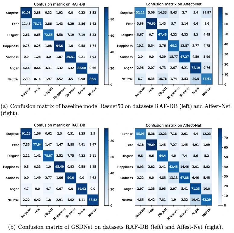 下图是GSDNet 与基线 Resnet50比较的混淆矩阵,混淆矩阵展示了ResNet50和GSDNet在RAF-DB和Affect-Net数据集上的表现。尽管Affect-Net数据集存在标注质量差和类别不平衡问题,GSDNet在RAF-DB上表现优于ResNet50,尤其在识别“恐惧”和“厌恶”表情时,精度分别提高了2.23%和6.32%。在Affect-Net数据集上,GSDNet在识别“惊讶”、“恐惧”和“中性”表情时,精度分别提高了3.84%、2.99%和8.68%。这表明GSDNet在表情识别任务中具有更强的能力和更好的性能。