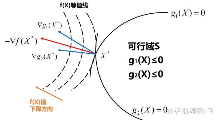 目标是最小化问题,若下降方向为右下方,则最优解(图中X*)一定不是在g(X)=0上,而是在可行域S内部