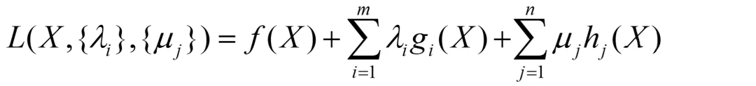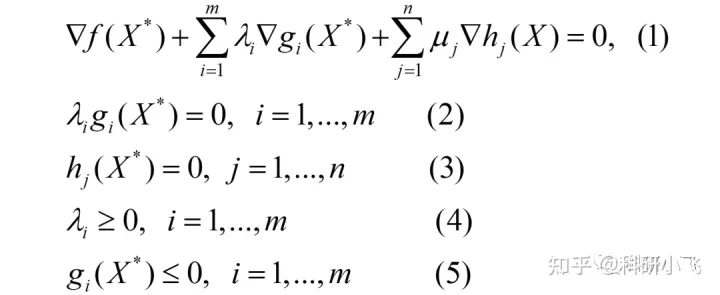 即,利用式(1)(2)(3)求最优X*和λi,然后通过式(4)和(5)验证这些解是否可行,“可行”指的是这些解是否能让(4)和(5)的不等号成立,不成立则排除。注意,μj是可以取任意值的,不受限制。因为它们是等式约束的拉格朗日乘子,不是不等式的乘子。