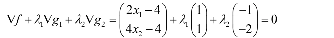 非常好,此时的λ1>0,λ2>0,满足KKT条件,故x1=1, x2=2是本题的最优解。