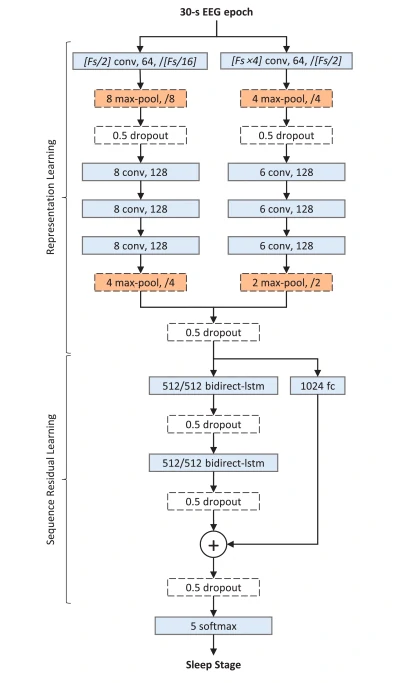 DeepSleepNet 的架构由两个主要部分组成,第一部分是表示学习,可以训练它学习过滤器,以从每个原始单通道 EEG epoch 中提取时不变特征。 第二部分是序列残差学习,可以训练它编码时间信息。该架构旨在按照 AASM 和 R&K 手册的标准对 30 秒 EEG 时期进行评分。