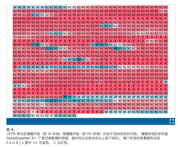 其次,我们分析了我们的模型如何利用双向 LSTM 从一系列 EEG epoch 中学习时间信息。具体来说,我们研究了双向 LSTM 如何管理它们的记忆细胞中使用 的可视化技术中。我们发现前向 LSTM 的几个记忆单元是可解释的。 例如,当受试者分别处于 W 或 N1 阶段时,几个细胞正在跟踪觉醒或睡眠开始,将它们的值重置为正数。然后,在阶段 N2、N3 和 REM(或简称为 R)期间,单元格值下降到负值(即变为不活动状态)。图 4 说明了根据我们的模型预测的一系列睡眠阶段,该单元格值的变化。睡眠阶段按时间从左到右,从上到下排列。 每个睡眠阶段颜色对应tanh(c),其中+1(即活动)是蓝色,-1 是红色(即不活动)。还有其他可解释的单元格,例如在每个受试者数据开始时以高值开始然后随着每个睡眠阶段缓慢下降直到受试者数据结束的那些单元格,或者当他们发现连续N3 和 REM 阶段的顺序。 这些细胞的存在表明,序列残差学习部分内部的 LSTM 学会了跟踪每个主体的当前状态,这对于根据阶段转换规则正确识别下一个睡眠阶段很重要。