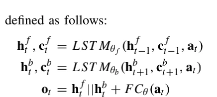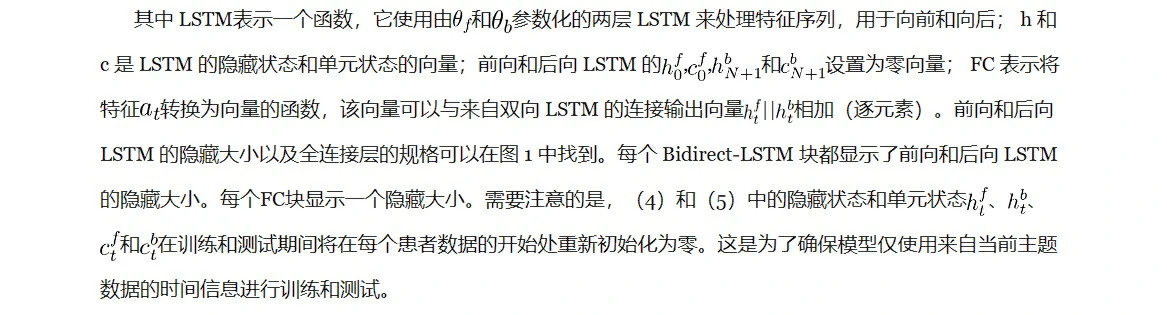 这部分由两个主要组件组成:双向LSTM和一个shortcut connection连接。我们使用shortcut connection将这部分重构为一个残差函数进行计算。这使我们的模型能够将它从先前输入序列中学习到的时间信息添加到从 CNN 中提取的特征中。我们还在shortcut connection中使用全连接层将来自 CNN 的特征转换为可以添加到 LSTM 输出的向量。该层通过其权重参数、批量归一化和ReLU 激活进行矩阵乘法运算。形式上,假设有来自 CNN {a1, … , aN} 的 N 个特征按顺序排列并且 t = 1 … N 表示 30-s EEG epochs 的时间索引,我们的序列残差学习定义如下: