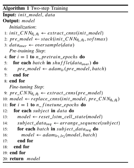 第二步是对整个模型使用顺序训练集进行有监督的微调。这可以在算法 1 的第 9-19 行中看到。这一步是将阶段转换规则编码到模型中,并对预训练的 CNN 进行必要的调整。具体来说,init_model 的两个 CNN 的参数 θs 和 θl 被替换为来自 pre_model 的参数,从而得到模型。然后使用具有两种不同学习率 lr1 和 lr2 的小批量 Adam 优化器,使用序列训练集训练模型。由于 CNN 部分已经过预训练,因此我们对 CNN 部分使用较低的学习率 lr1,对序列残差学习部分使用较高的学习率 lr2,以及一个 softmax 层。我们发现,当我们使用相同的学习率对整个网络进行微调时,预训练的 CNN 参数被过度调整为序列数据,这些数据不是类平衡的。结果,该模型在微调结束时开始过度拟合大多数睡眠阶段。因此,在微调期间使用了两种不同的学习率。此外,我们使用启发式梯度裁剪技术来防止梯度爆炸,这是训练 RNN(如 LSTM)时的一个众所周知的问题 [23]。当梯度超过预定义的阈值时,该技术使用全局范数将梯度重新调整为较小的值。顺序训练集是通过在所有受试者中根据时间顺序排列原始训练集而获得的。
