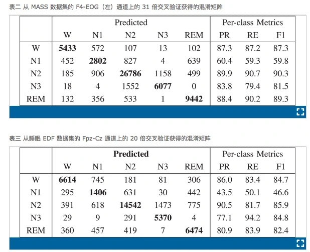 表二和三分别显示了从 MASS 和睡眠 EDF 数据集的 F4-EOG(左)和 Fpz-Cz 通道的31折和20折交叉验证中获得的混淆矩阵.我们没有包括从 Sleep-EDF 数据集的 Pz-Oz 通道获得的混淆矩阵,因为 Fpz-Cz 通道提供了更好的性能。每行和每列分别代表睡眠专家和我们的模型分类的每个睡眠阶段的 30 秒 EEG 时期的数量。粗体数字表示我们的模型正确分类的时期数。每行的最后三列表示从混淆矩阵计算的每类性能指标。可以看出,N1阶段表现最差,F1小于60,而其他阶段的F1明显更好,范围在81.5和90.3之间。大多数错误分类的阶段在 N2 和 N3 之间。还可以看出,混淆矩阵通过对角线几乎是对称的(N2-N3 对除外)。这表明错误分类不太可能是由于不平衡类问题引起的。图 2 展示了由睡眠专家手动评分的催眠图示例,并由我们的 DeepSleepNet 为 MASS 数据集中的 Subject-1 自动评分。