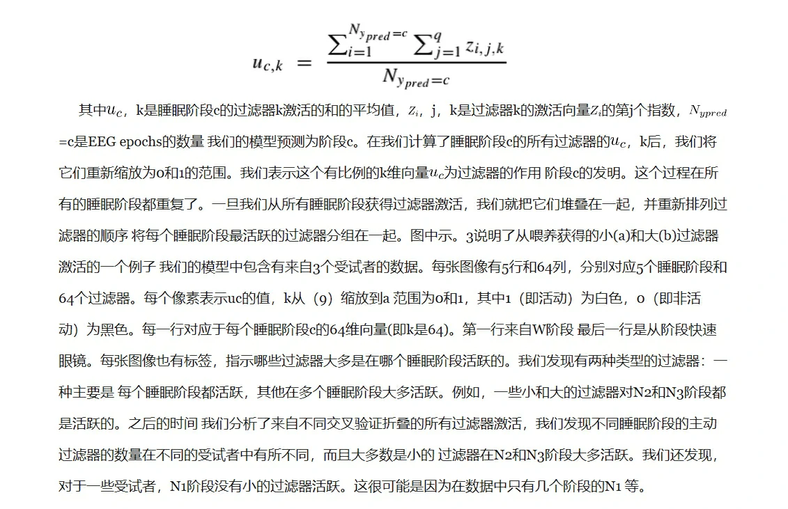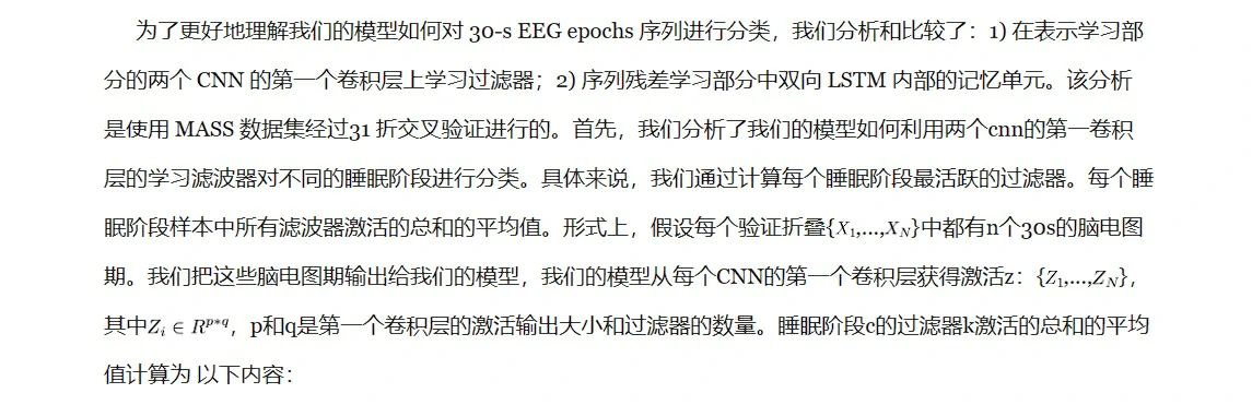 我们使用来自 MASS 数据集的 F4-EOG(左)通道评估我们的模型有两个主要原因,这与文献中报道的大多数依赖中央叶电极(如 Cz)的现有方法不同, C4 和 C3。 第一个原因是将评分性能与我们之前的手工工程方法进行比较。 第二个原因是,与现有方法相比,在睡眠诊所或家庭环境中收集数据更容易、更舒适。 这是因为两个电极都没有读取来自多毛头皮的电活动的问题。我们的模型分析结果还表明,我们的模型学习到了几个与AASM手册一致的特征。由于我们的模型会自动从原始脑电图中学习特征,因此我们的方法与手工工程网相比,DeepSleepNet模型是实现远程睡眠监测的更好方法。