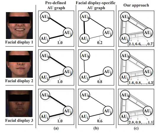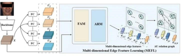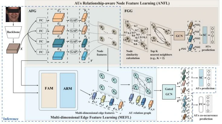 本文提出一种新的AU关系建模方法来解决上述问题,可以轻松地与各种深度学习骨架结合。它将由backbone生成的完整人脸表示作为输入,输出一个AUs关系图,该图显式描述了每对AUs之间的关系。