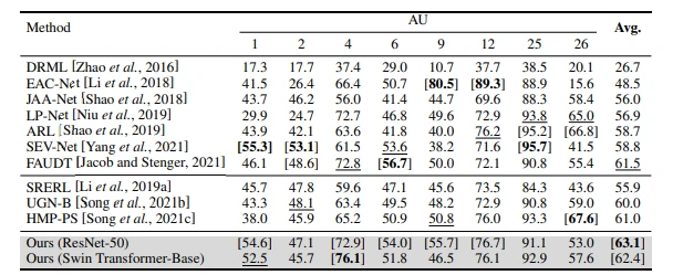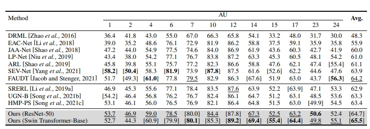 表1给出了在BP4D上的发生识别结果,可以观察到,作者所提的AU关系建模方法使得主干网(ResNet-50和Swin TransformerBase (Swin- b))获得比所有其他列出的方法更高的F1总分,比最先进的方法平均提高0.5%和1.3%。