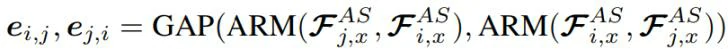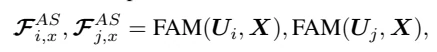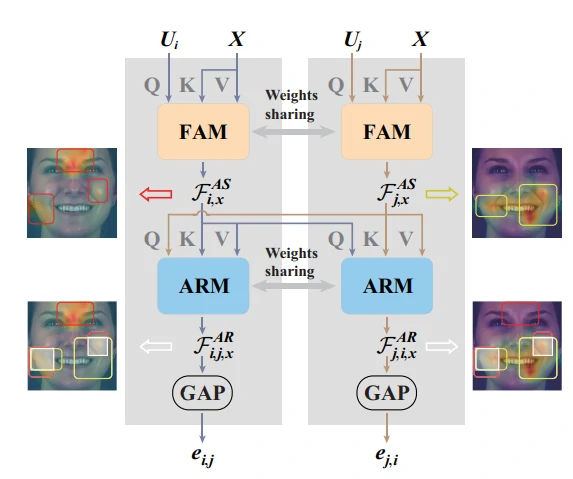 除了编码在节点特征中的关系线索,作者还提出了一个多维边缘特征学习(MEFL)模块来深度学习一对多维边缘特征,旨在显式地描述每对AU之间的任务特定的关系线索,学习多为边缘特征的流程如图3所示。重要的是,作者学习了论文2.1节中定义的连接和未连接节点对的边缘特征。即使一对节点的相似度很低,它们之间的关系仍然可能包含AU识别的关键线索,而这些线索在节点特征学习过程中被忽略。由于一个AU的激活也会影响其他AU的状态,因此一对AU之间的关系不仅可以通过它们的特征来反映,还可以通过其他面部区域定义的AU来反映。因此,MEFL模块由两个块组成:一个面部显示特定的AU表示建模(FAM)块,首先从完整的面部表示中定位每个AU的激活线索,另一个AU关系建模(ARM)块,进一步从这些定位线索中提取与两个AUs激活相关的特征。如图4所示,对于一对AU,FAM将它们的AU特定的特征映射Ui、Uj和完整的面部表示X作为输入。它首先分别在Ui和X以及Uj和X之间进行交叉注意,其中AU特定的特征映射Ui和Uj分别用作查询,而全人脸表示X则被视为键和值。这个过程可以表述为: