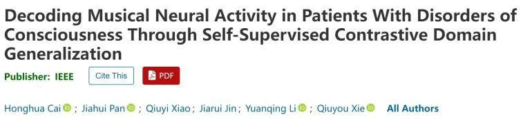该论文发表于IEEE Transactions on Affective Computing(CAAI A类期刊),题目为《Decoding Musical Neural Activity in Patients with Disorders of Consciousness through Self-Supervised Contrastive Domain Generalization》。