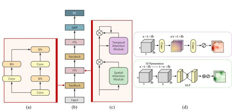 (1)编码器(encoder):SSCDG的编码器基于卷积神经网络(CNN)结构,并整合了残差结构(图1(a))和互联时空注意机制(Interrelated Temporal-Spatial Attention, ITS,图1(c))。编码器的任务是从EEG信号中提取频率、时间和空间域的信息。残差块和ITS机制的结合,使得编码器能够提取更多有意义的特征,从而提升特征提取的能力和完整性。ITS机制不仅能够捕捉EEG信号在时间和空间维度上的互补特征,还能够提取全局特征,确保时空信息的有效整合。