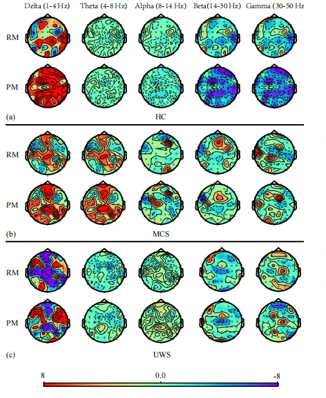 实验结果揭示了音乐刺激对意识障碍患者情绪的影响。具体来说,六名微意识状态(MCS)患者和一名无反应觉醒综合征(UWS)患者在听不同类型音乐时表现出情绪变化,尤其是他们对偏好音乐的反应更为积极。我们进一步分析了三组的绝对功率谱密度(APSD)特征,发现MCS患者在听偏好音乐时,在Delta频段的大脑活动模式与健康对照组相似。相比之下,UWS患者并未显示出这种模式。尽管UWS和MCS患者在Theta和Alpha频段的APSD特征有相似之处,但这并不表示UWS患者有意识。Theta频段的活动通常与困倦状态相关,反映的是大脑的自动处理过程,而非有意识的感知。UWS患者在听音乐时Alpha频段的活动可能仅表明皮层功能的残余,而非有意识的反应。因此,即使在Theta和Alpha频段有相似表现,UWS患者仍缺乏明确的意识迹象。