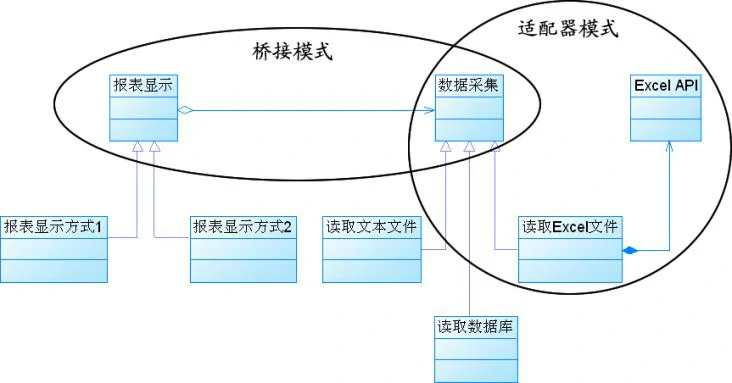 按照GOF的说法,桥接模式和适配器模式用于设计的不同阶段,桥接模式用于设计的前期,即在设计类的时候将类规划为逻辑和实现两大类,使他们可以分别进行演化;而适配器模式用于设计完成之后,当发现完成的类无法协同工作时,可以采用适配器模式。如下图的报表处理模块所示: