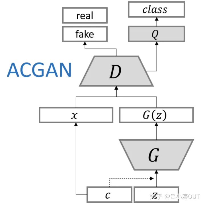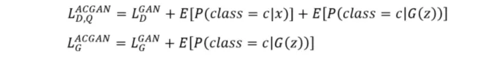 ACGAN模型与CGAN类似。生成器都是输入类标签c和噪声e。在判别模块中不再输入类标签,另外在输入样本是否为真的同时,利用另一个分类器来判断输入样本的所属类别。