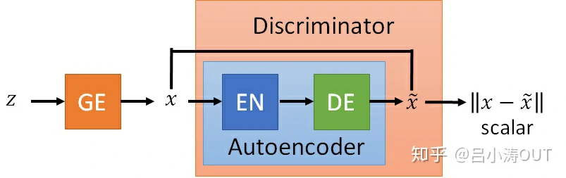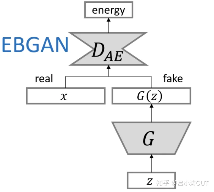 原始的GAN的辨别模块是简单的神经网络。这里使用基于能量的神经网络进行真实样本与虚假样本分布的距离衡量。EBGAN的判别器是一个自编码器。那么EBGAN就是将判别器的输入输出求一个重构误差(rescontruction error),也就是判别器的输出,也即所说的能量(energy)。