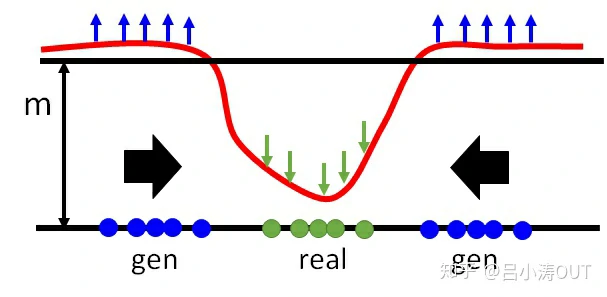 我们希望对于真实样本的重建误差小,同时希望由生成器生成的图片的能量小。那么D的损失函数中要最小化 -D(G(z)),就是最大化D(G(z)), 也就是要抬高下图中的蓝色点对应的曲线,但是如果没有margin的约束,可以无限制的抬高,所以我们需要一个m,即margin,就是当抬高到m这个距离后就没有惩罚了,所以此时loss就将不再忙着抬高,而是去将real对应的曲线也即D(x)拉小。generator做的事情就很好理解了,因为real对应的energy是小的,所以希望生成的图片的energy也是小的。
