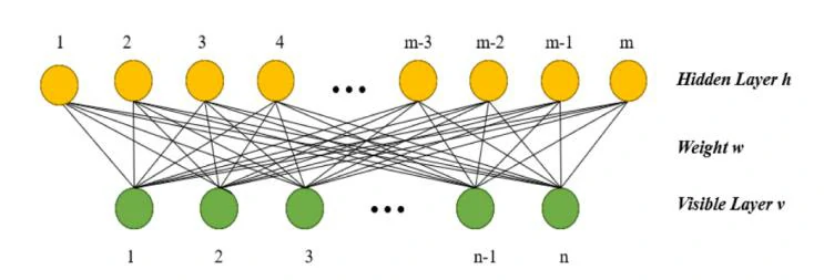 深度信念网络(DBN)是一个具有深度结构的概率生成模型,由一个受限玻尔兹曼机(RBM)组成。如图1所示,RBM只有两层神经元,一层称为可见层,由可见单元组成,用于输入训练数据。另一层称为隐藏层,由隐藏单元组成,用作特征检测器。输入数据对应于可见层,提取的特征可以被看作是隐藏层。模型在同一层上没有内部连接。