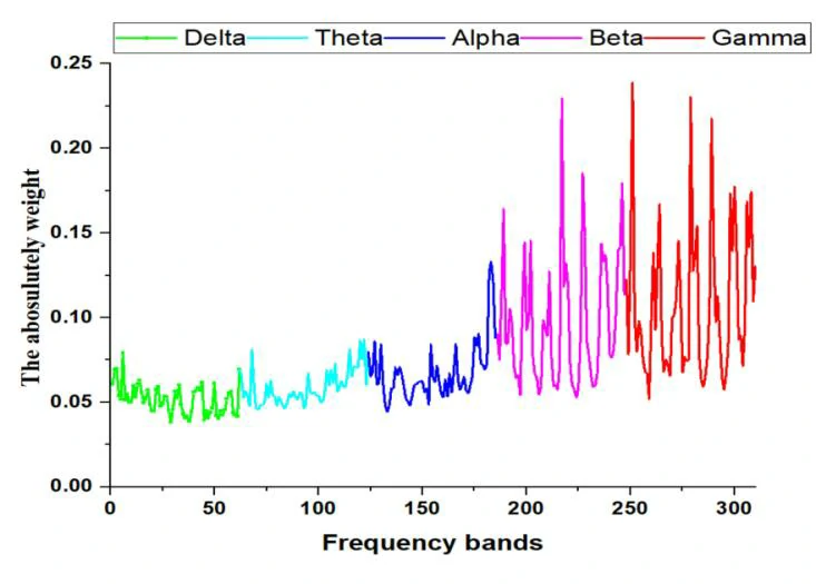 为了减少融合特征的维度,文章使用了权重分析来选择与情感密切相关的特征信息。选择了包括FP2、FP1、FT7、FPZ、F7、T8、F8、CB2、CB1、FT8、T7和TP8在伽马波段的12个主要脑电通道,以及前额、眼睛和眉毛周围的前30个面部表情特征来进行情感分类。结果显示,在聋人情感识别中,通过特征选择,分类准确率达到了99.92%。