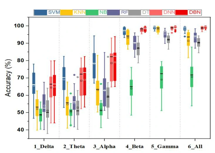 在五个频带中七种分类器的分类性能实验结果如图5所示。从五个EEG节律频带中,结果显示γ波和β波的分类准确性比α、θ和δ波高,这表明γ波与聋人情感密切相关,β波也可以粗略反映聋人情感的变化。此外,结果还显示,将五个节律波段合并为一个特征向量时,采用SVM、KNN、NB、RF和DT等分类方法会导致性能下降。这可能表明在融合多频段信息时可能存在大量冗余信息,这将影响传统机器学习方法对情感分类的准确性。然而,所提出的DBN可以在一定程度上避免特征冗余的影响,并提高分类性能。