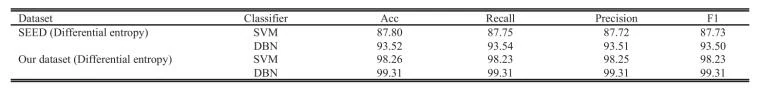 为了验证所收集的聋人脑电信号在与SEED数据集相同范式下的质量,本文在SEED数据集中提取了DE特征,采用了SVM和DBN进行了10折交叉验证。从表3中可以看出,通过SVM,**聋人在相同范式和条件下的分类准确度比正常人高出10.44%**,这可能表明所收集的聋人脑电信号质量更高。此外结果显示,与SVM相比,DBN模型的分类准确度提高了5.72%。