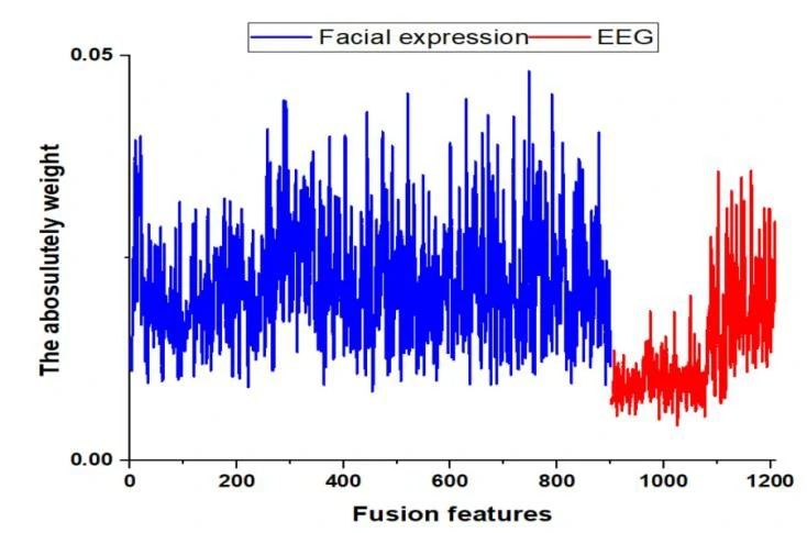 对于所有特征融合,分类准确率为98.35%,比面部表情情感识别高0.14%,比EEG情感识别低0.96%。多模态融合方法的分类准确度较低可能是由于特征冗余造成的。因此,本文计算了基于聋人面部表情和EEG融合特征的平均权重。从图7中可以看出,每种模态特征中都存在一些绝对权重较小的值,这可能导致特征冗余并影响情感分类的性能。
