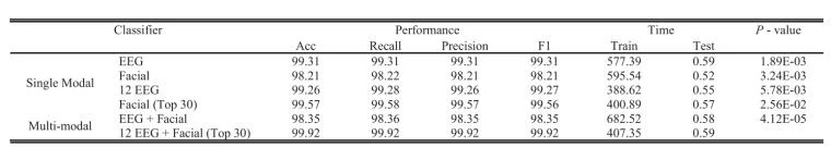 本文在特征选择后对单一模态进行了情感分类。然后,更新后的30个面部特征和伽马波段中的12个主要EEG通道特征被合并为42维的融合向量用于情感识别。如表4所示,对于单一模态,在特征选择后,分类准确率分别为99.26%(伽马波段中的12个主要EEG通道)和99.57%(前30个面部表情特征)。此外,不同方法之间进行了成对样本t检验,结果p < 0.05。此方法的时间复杂度也得到了降低。
