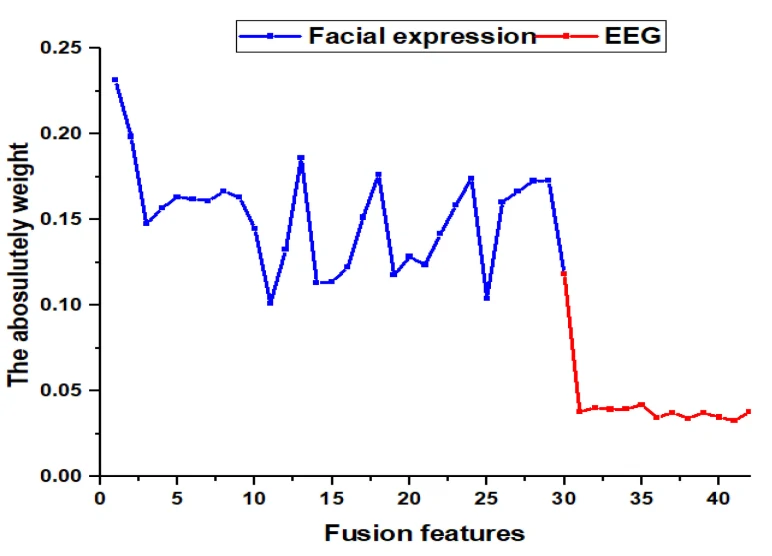 为了进一步分析所选择的融合特征,图8显示了更新后融合特征的权重分析。可以看到,面部表情特征的权重明显比EEG特征大。