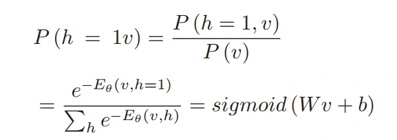 由于RBM是一个二分图,所以在层内没有边连接,因此给定可见层节点的值,隐藏层的激活是有条件独立的。同样地,给定隐藏层的值,可见层节点的激活状态也是有条件独立的。因此,可见层v对于隐藏层h的条件概率如下: