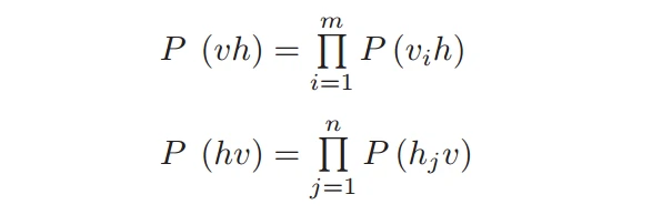 由于RBM层内没有连接,同一层中的变量也是彼此独立的,可以得到以下公式: