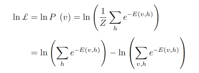 RBM的训练目的是将原始数据的分布保持在最大程度上,并且最大似然估计是为了最大化P(v)。使用对数似然函数,公式如下:
